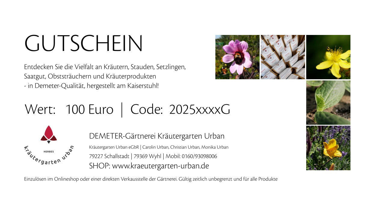 ...immer ein gutes Geschenk. Vor allem in Verbindung mit einem leckeren Tee, einem Hydrolat oder ein paar Saatguttütchen! Wählen Sie einfach passende Produkte und erstellen Sie sich eine Art Geschenkpaket - so wird der Gutschein begleitet von Duft, Geschmack oder Vorfreude. Und der Beschenkte hat noch die Möglichkeit selbst zu stöbern.
