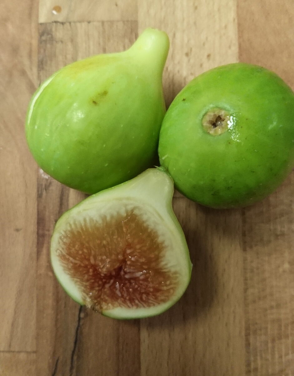 Frucht: Schale gelb-grün, Fruchtfleisch hellorange-lachsfarben, feste Schale, honigsüß, sehr gutes, süßes, typisches Feigenaroma, selbstbefruchtend