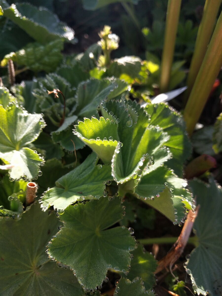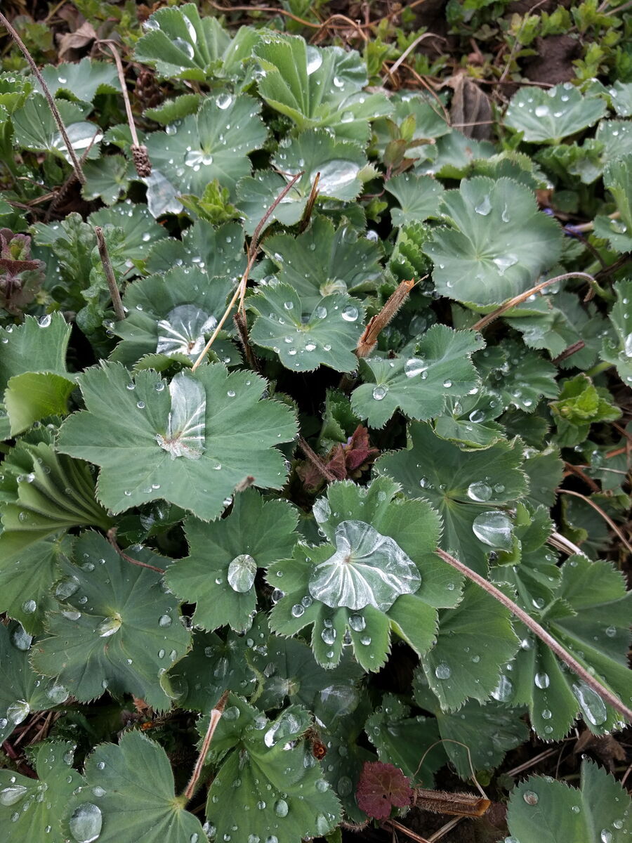 Die niedrigen, rhizombildenden Polster schmücken sich mit vieleckigen weichen Blättern in einem behaarten grün. Diese sehen in der Tat aus wie ein Umhängecape. Das schönste am Frauenmantel ist seine Art, mit seinen wasserabweisenden Blättern Wassertropfen zu sammeln. Tautropfen sitzen wie Diamanten den ganzen Blattrand entlang. Und größere Tropfen leuchten und funkeln in der Blattmitte.