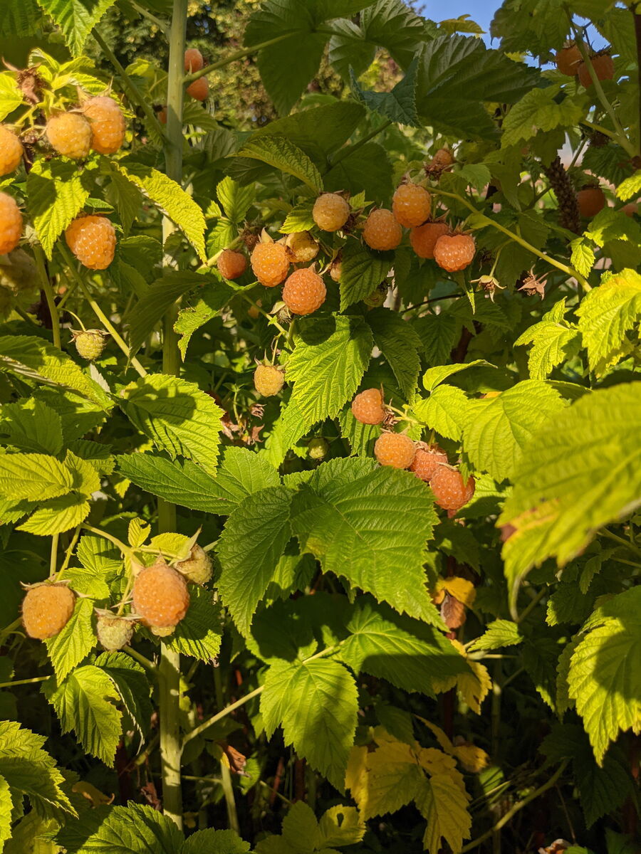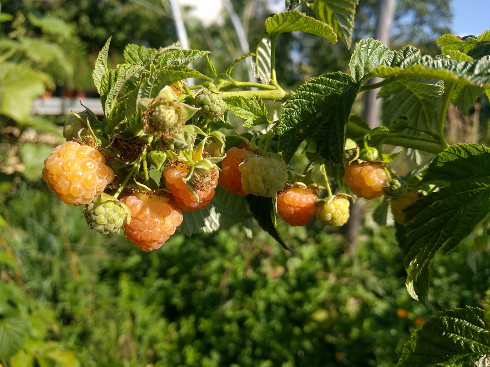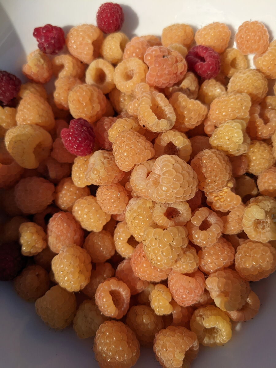 Himbeere mit vielen mittelgroßen eher runden Früchten. Gelb und sehr süß, ohne die himbeertypische Säure. Sie sind reif, wenn das Gelb einen leichten Pfirsichton bekommt und die Himbeeren sich leicht abziehen lassen.