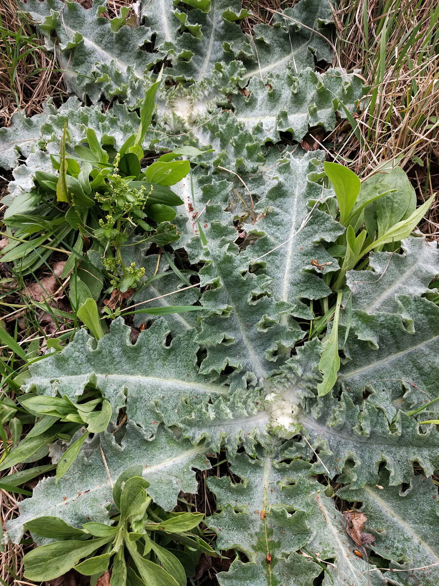 Die zweijährige Distel mit den silbergrauen, dicht behaarten Blättern kann bis zu 3m hoch und 1,50m breit werden. Sie bildet eine lange Pfahlwurzel.