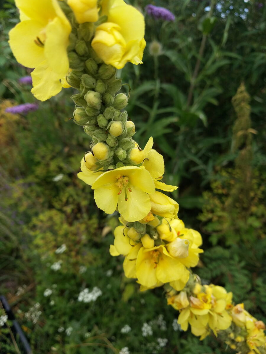 Die Großblütige Königskerze hat länglich elliptische, silbergrau behaarte Blätter, diese sind regelrecht filzig. Der Blütenstand kann von 80cm bis über 2 m hoch werden. Er besteht aus mehreren beblätterten Stielen mit walzenförmigen Blütenrispen, welche von unten nach über über mehrere Monate aufblühen. Die Blüten sind sonnengelb und bei Insekten beliebt.
