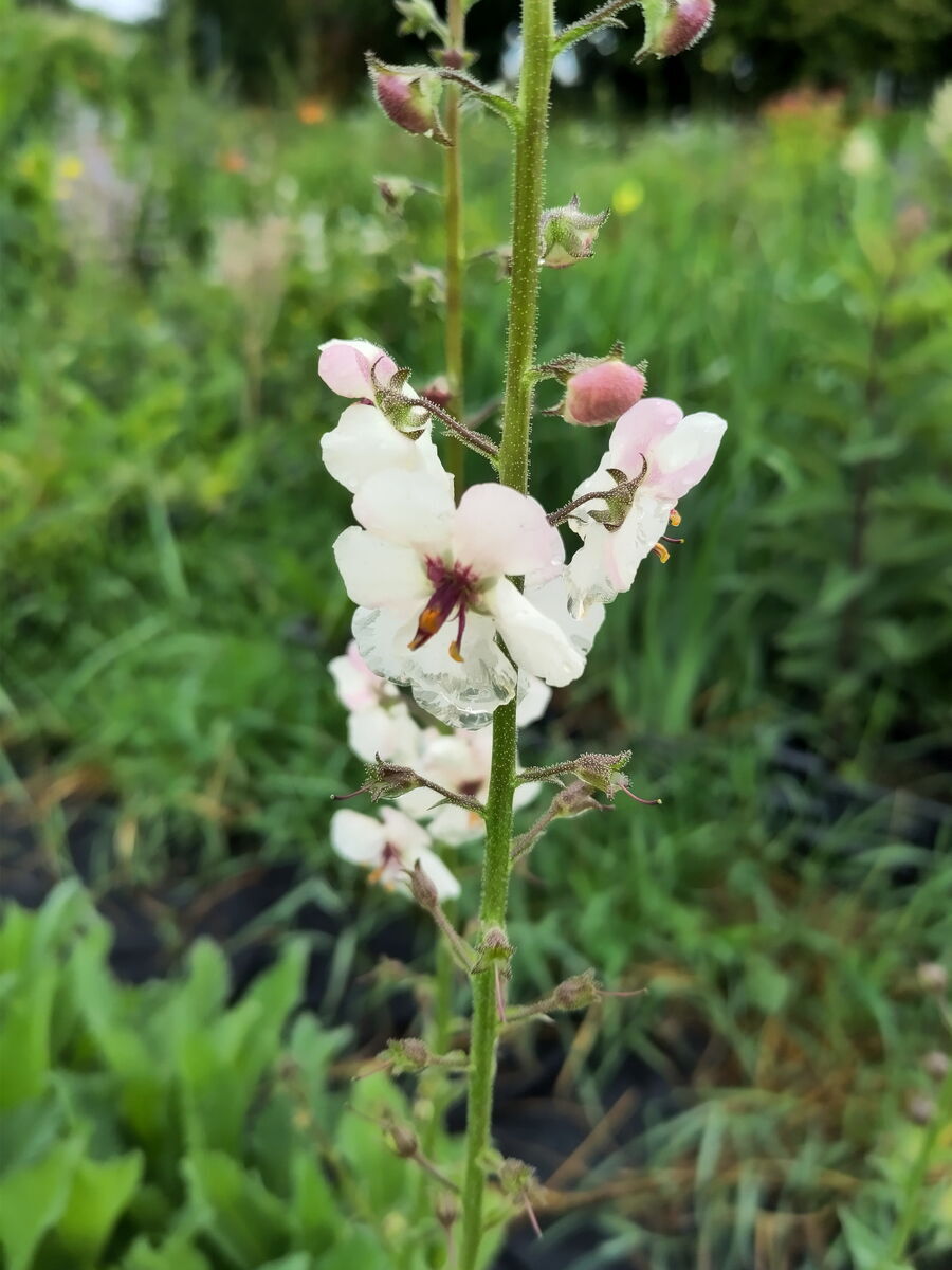 Die glatten, dunkelgrün glänzenden Blätter schmiegen sich flach an den Boden an, sind rundgelappt und bilden eine Rosette. Ab Juli bilden sich filigrane Stängel von 100-150cm Länge. Anders als bei den "normalen" Königskerzen ist die Blütenrispe locker, die bis zu 3cm großen Blüten stehen einzeln an 3-5cm langen, hauchdünnen Stielen vom Stengel ab. Es bilden sich zahlreiche Blütenseitentriebe.