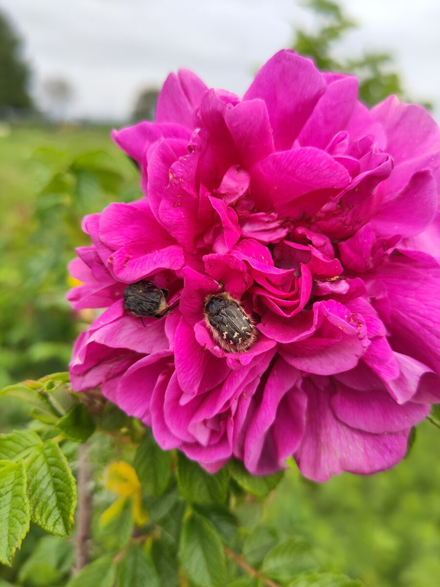 Bewärte halbfüllte Sorte für Hecken, zum Begrünen, zum einfassen... Die Rose wird bis zu 1,50m hoch und schmückt sich mit vielen, Grüßen Dunkelrosa Blüten, die auch bei Bienen und Käfern bemüht sind. Die Hagebutten sind sehr groß, sie können gut verarbeitet werden.
