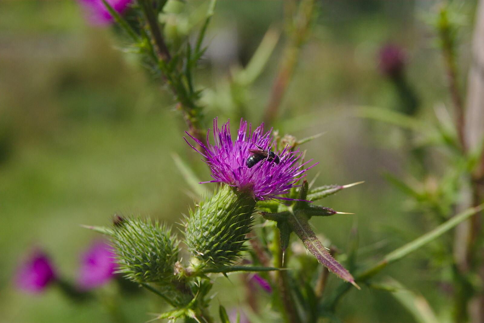 Hier geht es aber um die GEWÖHNLICHE KRATZDISTEL. Diese ist zweijährig, recht groß und blüht, das es eine wahre Freude ist. Für die unzähligen verschiedenen Bienen und Hummeln, Falter und sonstige Insekten, die hier viele Monate einen reich gedeckten Tisch vorfinden. Und für einige Falter wie den Distelfalter, welche an Disteln fressen, sowie Vögeln, welche sich von den Samen ernähren. Sie ist auch eine wahre Freude für den genauen Betrachter, denn Disteln sind zwar unnahbar, aber sehr raffiniert und kleine Kunstwerke.
