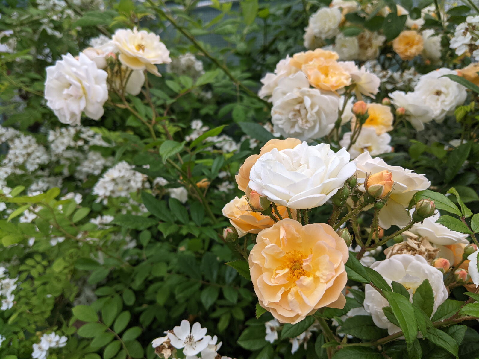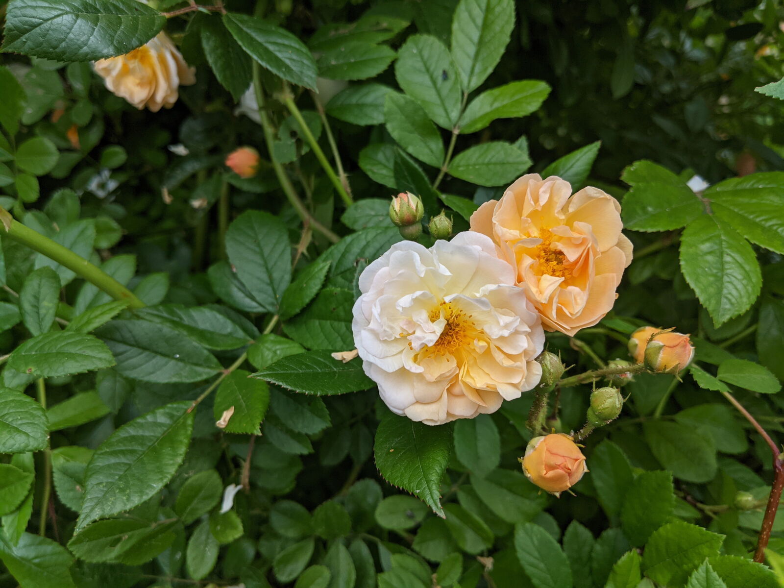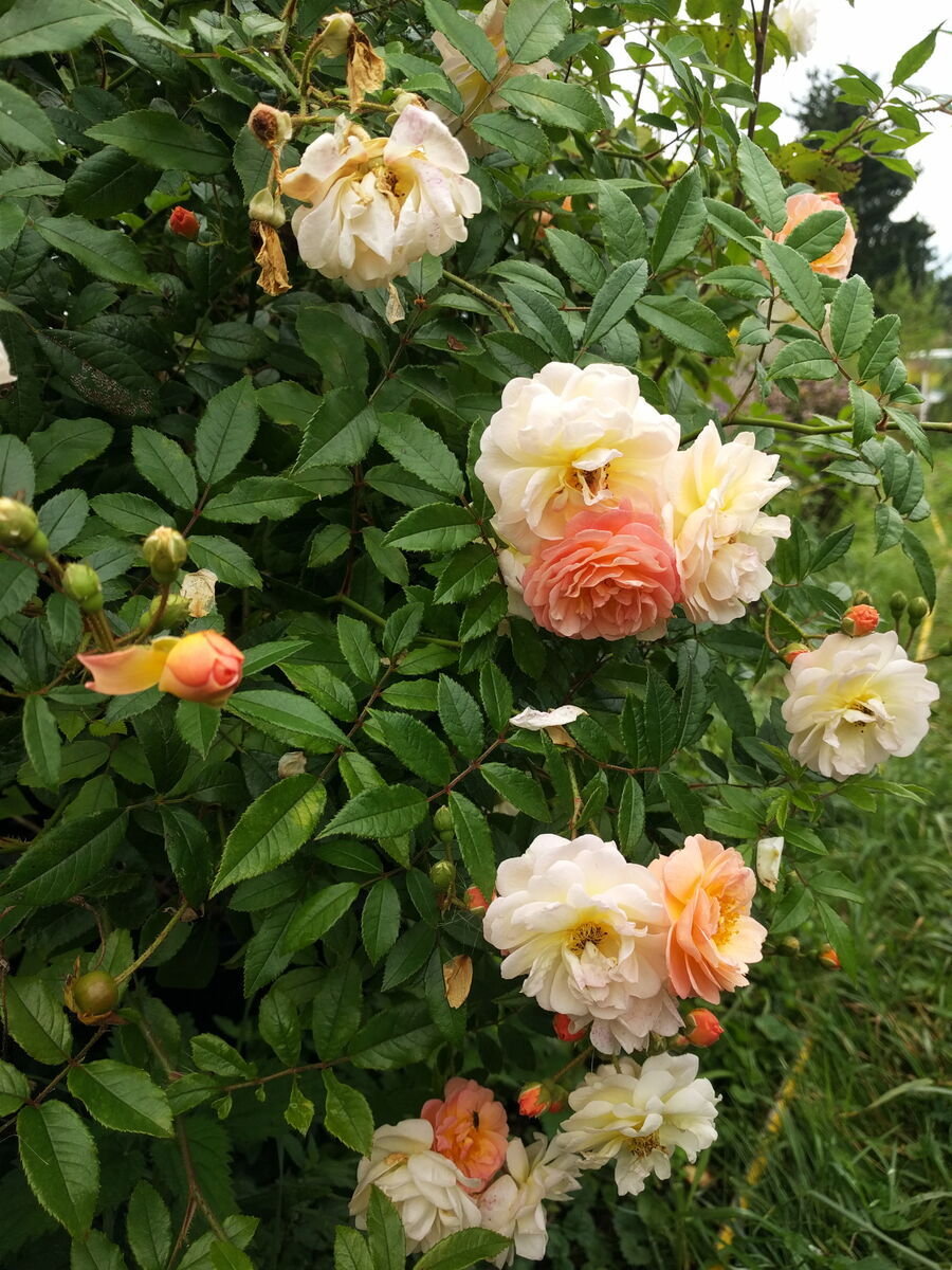 Und die Blüten... erst perfekte pfirsichfarbene Röschen, gehen dann auf zu halbgefüllten, duftenden Blütentrauben mit Blüten von 3-5cm, ändern dann, je nach Temperatur und Besonnung die Farbe in gelb, rosa, pfirsich oder weiß. Es sind also immer unterschiedliche Farben an der Pflanze.