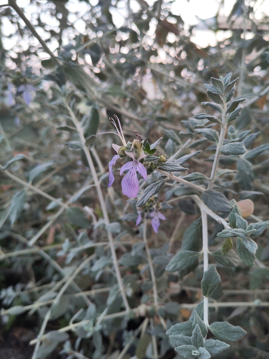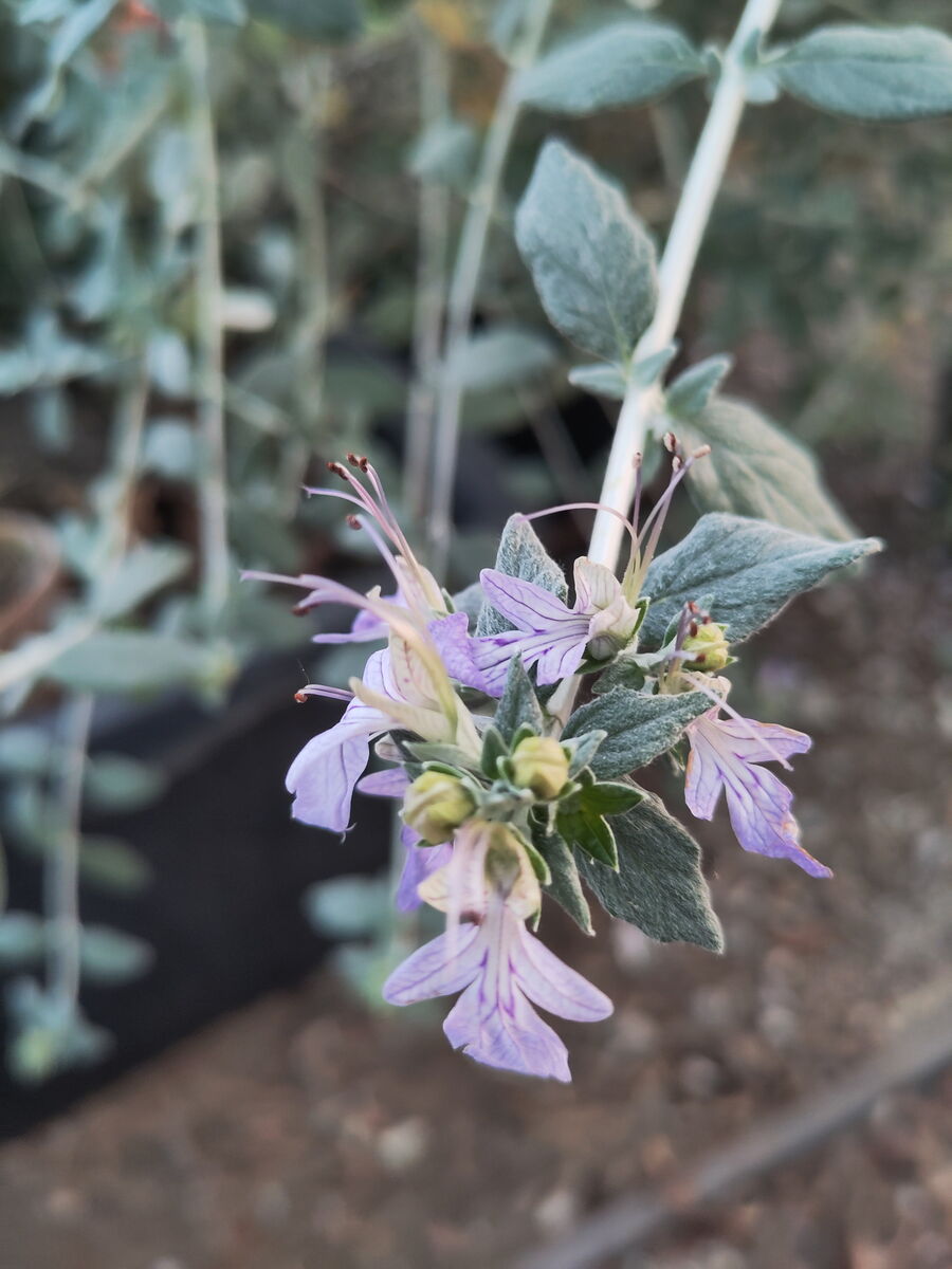 Die Blätter in silber-grün, leicht behaart, die Blüten fliederfarben und zahlreich. Der strauchige Gamander wächst üppig und dicht und ist äußerst schnittverträglich - er kann zu Hecken, Formen und kurz geschnitten werden. Ziert er im europäischen Süden doch fast jeden Ferienwohnungsgarten (zumindest in der Algarve!)
